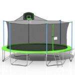 安全密封系统-带有外壳的16英尺蹦床具有360度安全网,该安全网一直牢固地固定在跳垫上,从而降低了手臂或腿掉入的危险。带有拉链门的完整外壳一定会让您安心。防锈钢四步梯可帮助您快速安全地上蹦床。有一个篮板,您可以在其中打篮球。