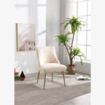 This side chair is supported by four thin metal legs, finished in a golden hue to finish off the glam look.