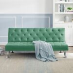Durably crafted with soft fabric and chrome metal legs, this convertible futon sofa fuses comfort and style that will last in your living space for years to come.