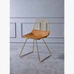 It is showcasing a whiskey faux leather seat cushion with a gold metal frame.