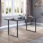 The metal frame is topped with a rectangular tabletop in a rich black that offers a modern appearance and display space.
