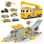 The dump truck toy with a play mat, including an oversized digger, a crane, and eight mini matchbox cars (crane, bulldozer, cement mixer, dump truck, etc.), and various simulated road signs. Open the construction drawings, your little engineer will build his own world on this construction site.