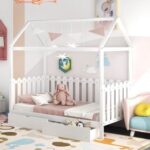 The wood house platform bed with two drawers offers storage space for clothes and toys, Maximize space, and helps to develop your child’s habit of storage, It’s a perfect space-saving solution for you.
