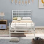 It has a metal frame with sleek curved edges. The panel headboard and footboard feature an open look with multiple vertical slats and finials at either end.
